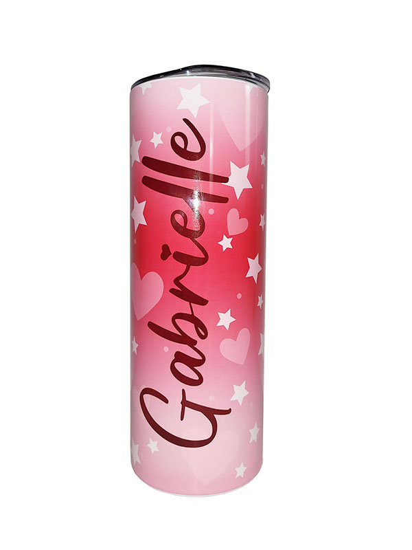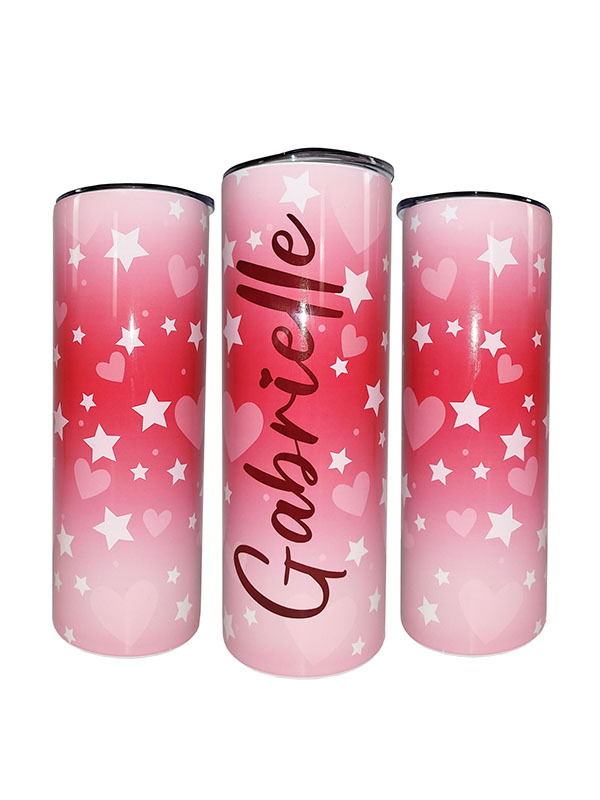 A pink tumbler adorned with charming stars and hearts, radiating whimsy and cheer with its delightful design. Its playful motifs lend a touch of joy to every sip.