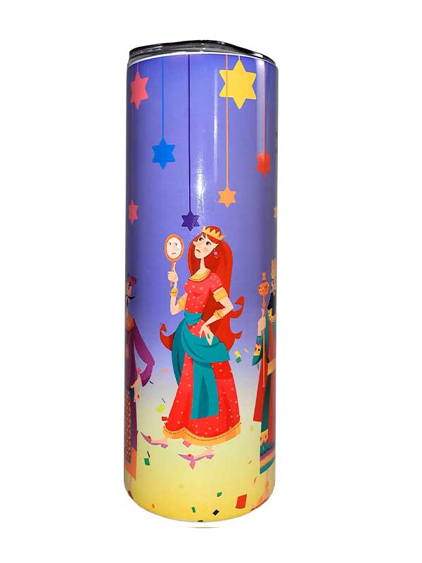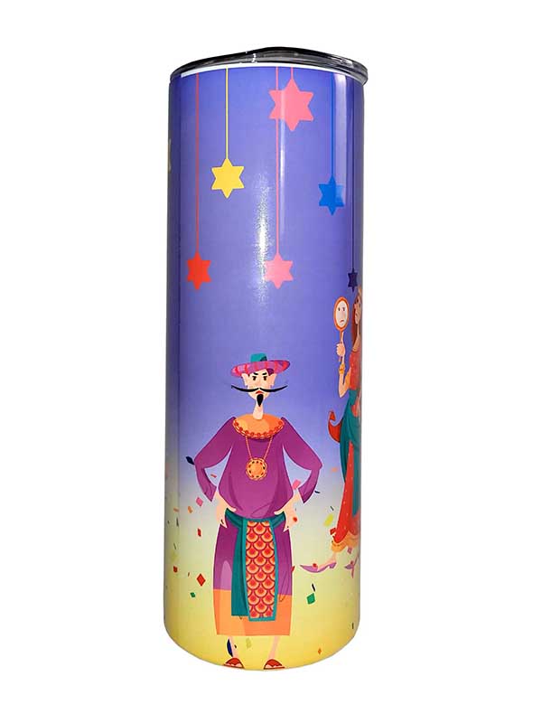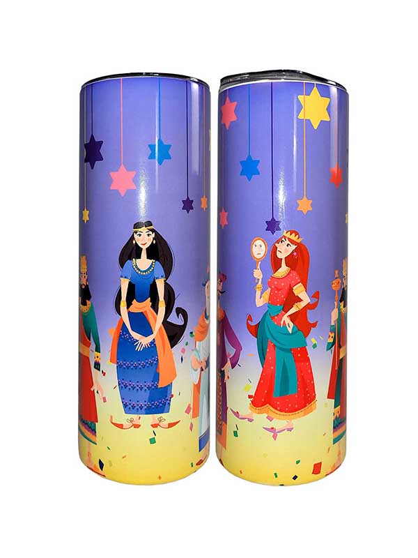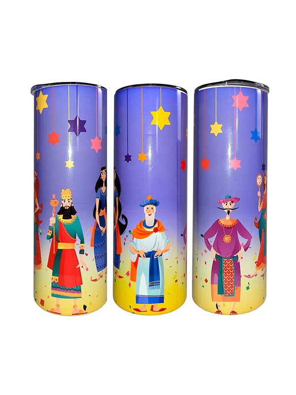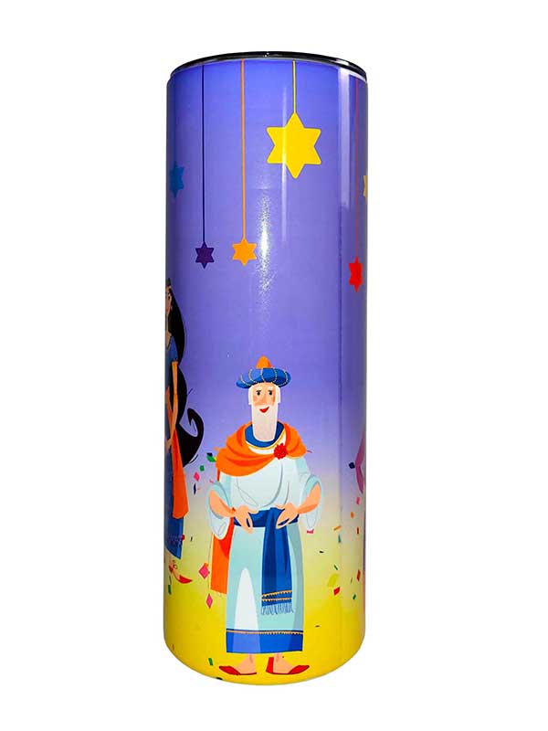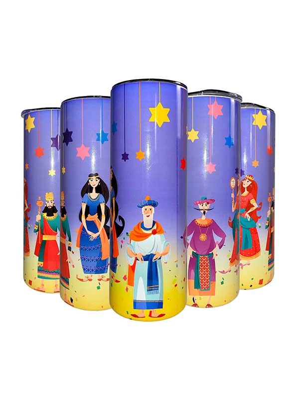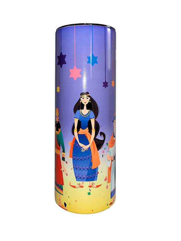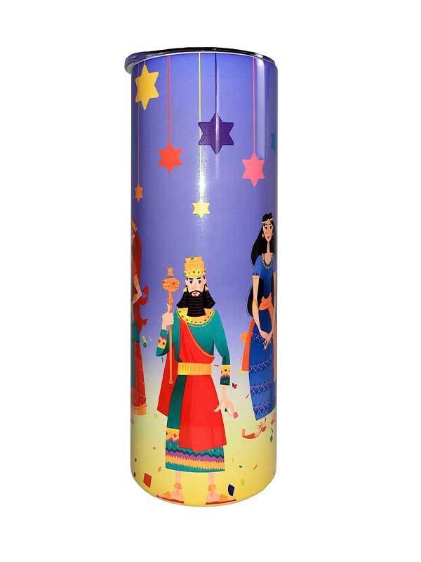 Celebrate the joy of Purim with our festive holiday tumbler! This charming tumbler features characters from the Megillat Esther. It desplays colourful characters of King Ahashverosh, Mordahai, Haman, Queen Esther and Queen Vashti.